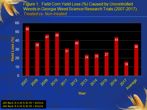 Figure 1.  Field Corn Yield Loss (%) Caused by Uncontrolled Weeds in Georgia Weed Science Research Trials (2007-2017). Treated vs. Non-treated <BR>200 Bu/A X 0.36 X $3.50 = $252/A <BR>200 Bu/A X 0.16 X $3.50 = $112/A<BR>