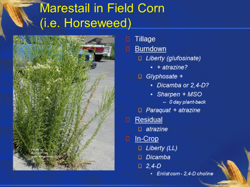 Marestail in Field Corn (i.e. Horseweed)<BR>Tillage <BR>Burndown <BR>Liberty (glufosinate) <BR>+ atrazine? <BR>Glyphosate + <BR>Dicamba or 2,4-D? <BR>Sharpen + MSO <BR>0 day plant-back <BR>Paraquat + atrazine <BR>Residual <BR>atrazine <BR>In-Crop <BR>Liberty (LL) <BR>Dicamba <BR>2,4-D  <BR>Enlist corn - 2,4-D choline<BR>