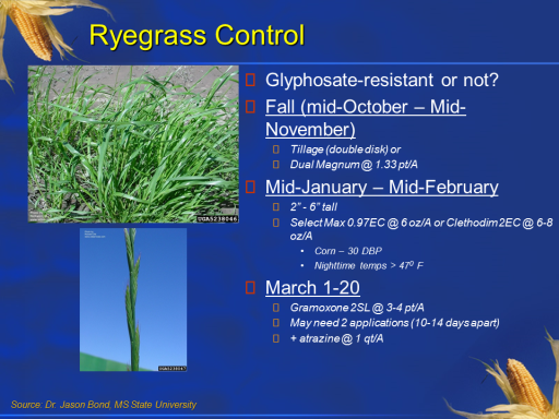 Ryegrass Control<BR>Glyphosate-resistant or not? <BR>Fall (mid-October – Mid-November) <BR>Tillage (double disk) or <BR>Dual Magnum @ 1.33 pt/A <BR>Mid-January – Mid-February <BR>2” - 6” tall <BR>Select Max 0.97EC @ 6 oz/A or Clethodim 2EC @ 6-8 oz/A <BR>Corn – 30 DBP <BR>Nighttime temps > 470 F <BR>March 1-20 <BR>Gramoxone 2SL @ 3-4 pt/A <BR>May need 2 applications (10-14 days apart) <BR>+ atrazine @ 1 qt/A  <BR>Source: Dr. Jason Bond, MS State University<BR>