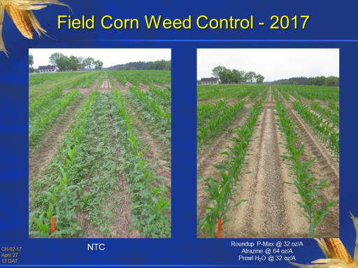 Field Corn Weed Control - 2017<BR>CN-02-17 <BR>April 27 <BR>13 DAT<BR>NTC<BR>Roundup P-Max @ 32 oz/A <BR>Atrazine @ 64 oz/A <BR>Prowl H2O @ 32 oz/A<BR>