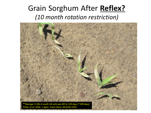 Grain Sorghum After Reflex? (10 month rotation restriction)<BR>**Average ½-life in south GA soils was 80 to 128 days (~100 days) Potter et al. 2016. J. Agric. Food Chem. 64:5156-5163<BR>