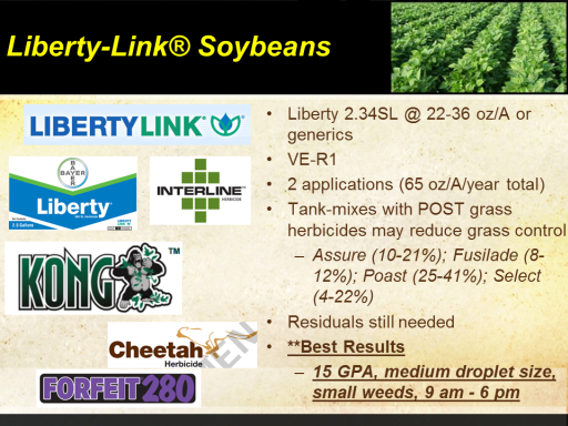 Liberty-LinkŪ Soybeans<BR>Liberty 2.34SL @ 22-36 oz/A or generics <BR>VE-R1 <BR>2 applications (65 oz/A/year total) <BR>Tank-mixes with POST grass herbicides may reduce grass control   <BR>Assure (10-21%); Fusilade (8-12%); Poast (25-41%); Select (4-22%) <BR>Residuals still needed <BR>**Best Results <BR>15 GPA, medium droplet size, small weeds, 9 am - 6 pm <BR> <BR>