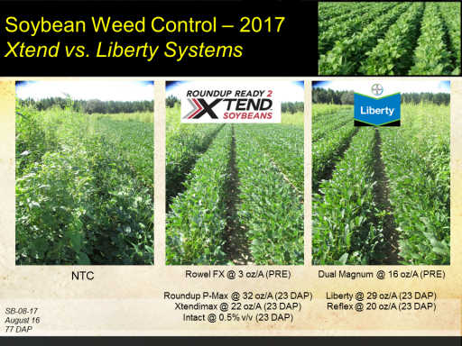 Soybean Weed Control – 2017 Xtend vs. Liberty Systems<BR>SB-08-17 <BR>August 16 <BR>77 DAP<BR>NTC<BR>Rowel FX @ 3 oz/A (PRE) <BR> <BR>Roundup P-Max @ 32 oz/A (23 DAP) <BR>Xtendimax @ 22 oz/A (23 DAP) <BR>Intact @ 0.5% v/v (23 DAP)<BR>Dual Magnum @ 16 oz/A (PRE) <BR> <BR>Liberty @ 29 oz/A (23 DAP) <BR>Reflex @ 20 oz/A (23 DAP)<BR>