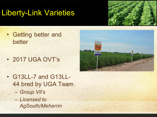 Liberty-Link Varieties<BR>Getting better and better <BR> <BR>2017 UGA OVT’s <BR> <BR>G13LL-7 and G13LL-44 bred by UGA Team <BR>Group VII’s <BR>Licensed to AgSouth/Meherrin<BR>