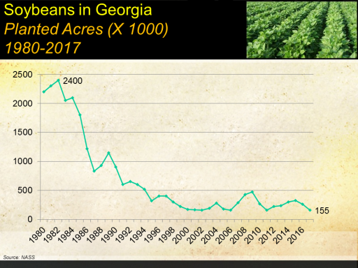 Soybeans in Georgia Planted Acres (X 1000) 1980-2017<BR>Source: NASS<BR>