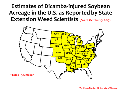 900k<BR>250k<BR>250k<BR> <BR><1k<BR>265k<BR>55k<BR>15k<BR>      <BR>      1k<BR>       3k<BR> <BR><1k<BR>325k<BR>50k<BR>150k<BR>100k<BR>        2.5k<BR> <BR> <BR> <BR>    400k<BR> <BR> <BR>©Dr. Kevin Bradley, University of Missouri<BR>Estimates of Dicamba-injured Soybean Acreage in the U.S. as Reported by State Extension Weed Scientists (*as of October 15, 2017) <BR>250 <BR>  k<BR>600k<BR>33k<BR>10k<BR>*Total: ~3.6 million <BR><1k <BR><1k <BR><1k <BR><1k <BR><1k <BR>