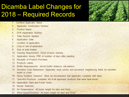 Dicamba Label Changes for 2018 – Required Records<BR>Certified Applicator Name <BR>Applicator Certification Number <BR>Product Name <BR>EPA registration Number <BR>Total Amount Applied <BR>Application Date <BR>Location of application <BR>Crop or site of application <BR>Size of area treated <BR>Training Requirement: Proof of auxin training <BR>Application timing: PRE or number of days after planting <BR>Receipts of Product Purchase <BR>Products Labels <BR>Buffer Requirements: record buffer distance calculations <BR>Sensitive Crop Awareness: Applicator must survey and document neighboring fields for sensitive areas or crops <BR>Spray Systems Cleanout:  Must be documented that applicator complied with label. <BR>Tank-Mix-Products: complete list of all approved products that were tank-mixed <BR>Application Start and Finish Times <BR>Nozzle Selection <BR>Air Temperature:  At boom height for start and finish <BR>Wind Speed/Direction: At boom height for start and finish <BR>