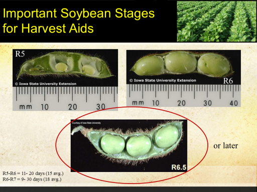 Important Soybean Stages for Harvest Aids<BR>R5<BR>R6<BR> or later<BR>R5-R6 = 11- 20 days (15 avg.) <BR>R6-R7 = 9- 30 days (18 avg.)<BR>