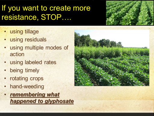 If you want to create more resistance, STOP….<BR>using tillage <BR>using residuals <BR>using multiple modes of action <BR>using labeled rates <BR>being timely <BR>rotating crops <BR>hand-weeding <BR>remembering what happened to glyphosate<BR>