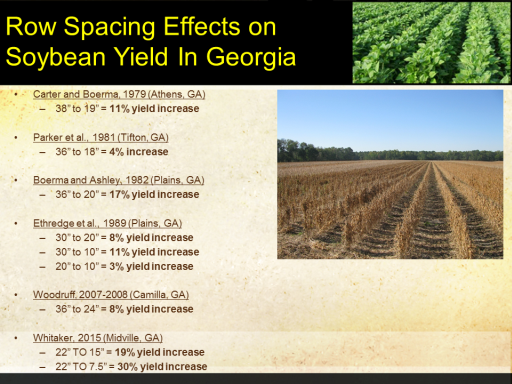 Row Spacing Effects on Soybean Yield In Georgia<BR>Carter and Boerma, 1979 (Athens, GA) <BR>38” to 19” = 11% yield increase <BR> <BR>Parker et al., 1981 (Tifton, GA) <BR>36” to 18” = 4% increase  <BR> <BR>Boerma and Ashley, 1982 (Plains, GA) <BR>36” to 20” = 17% yield increase <BR> <BR>Ethredge et al., 1989 (Plains, GA) <BR>30” to 20” = 8% yield increase <BR>30” to 10” = 11% yield increase <BR>20” to 10” = 3% yield increase <BR> <BR>Woodruff, 2007-2008 (Camilla, GA) <BR>36” to 24” = 8% yield increase <BR> <BR>Whitaker, 2015 (Midville, GA) <BR>22” TO 15” = 19% yield increase <BR>22” TO 7.5” = 30% yield increase <BR> <BR> <BR>