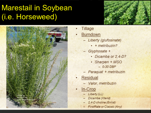Marestail in Soybean (i.e. Horseweed)<BR>Tillage <BR>Burndown <BR>Liberty (glufosinate) <BR>+ metribuzin? <BR>Glyphosate + <BR>Dicamba or 2,4-D? <BR>Sharpen + MSO <BR>0-30 DBP <BR>Paraquat + metribuzin <BR>Residual <BR>Valor, metribuzin <BR>In-Crop <BR>Liberty (LL) <BR>Dicamba (Xtend) <BR>2,4-D choline (Enlist) <BR>FirstRate or Classic (Any)<BR>