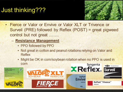 Just thinking???<BR>Fierce or Valor or Envive or Valor XLT or Trivence or Surveil (PRE) followed by Reflex (POST) = great pigweed control but not great ……. <BR>Resistance Management <BR>PPO followed by PPO <BR>Not great in cotton and peanut rotations relying on Valor and Reflex <BR>Might be OK in corn/soybean rotation when no PPO is used in corn<BR>