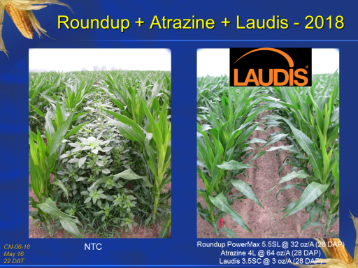 Roundup + Atrazine + Laudis - 2018<BR>CN-06-18 <BR>May 16 <BR>22 DAT <BR>NTC<BR>Roundup PowerMax 5.5SL @ 32 oz/A (28 DAP) <BR>Atrazine 4L @ 64 oz/A (28 DAP) <BR>Laudis 3.5SC @ 3 oz/A (28 DAP)<BR>