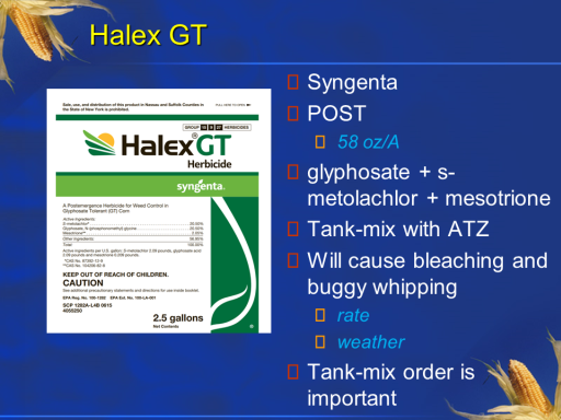 Halex GT<BR>Syngenta <BR>POST <BR> 58 oz/A <BR>glyphosate + s-metolachlor + mesotrione <BR>Tank-mix with ATZ <BR>Will cause bleaching and buggy whipping <BR> rate <BR> weather <BR>Tank-mix order is important <BR>