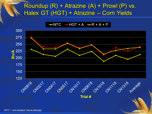 Roundup (R) + Atrazine (A) + Prowl (P) vs. Halex GT (HGT) + Atrazine – Corn Yields<BR>NTC = non-treated check (weedy)<BR>