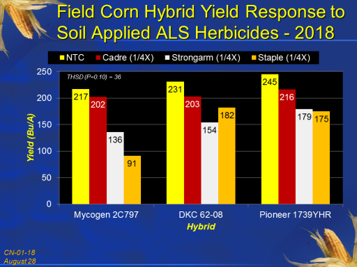 Field Corn Hybrid Yield Response to Soil Applied ALS Herbicides - 2018<BR>THSD (P=0.10) = 36<BR>CN-01-18 <BR>August 28<BR>