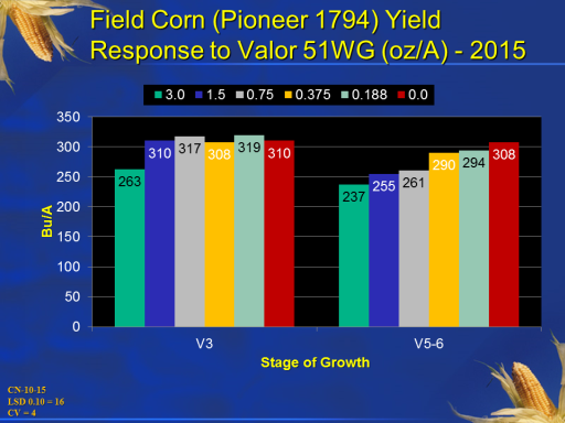 Field Corn (Pioneer 1794) Yield Response to Valor 51WG (oz/A) - 2015<BR>CN-10-15 <BR>LSD 0.10 = 16 <BR>CV = 4<BR>