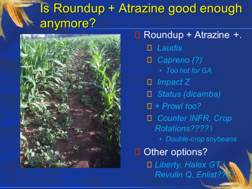 Is Roundup + Atrazine good enough  anymore?<BR>Roundup + Atrazine +. <BR> Laudis <BR> Capreno (?) <BR>Too hot for GA <BR> Impact Z <BR> Status (dicamba) <BR>+ Prowl too? <BR> Counter INFR, Crop Rotations????	\ <BR>Double-crop soybeans <BR>Other options? <BR>Liberty, Halex GT, Revulin Q, Enlist???? <BR>	<BR>