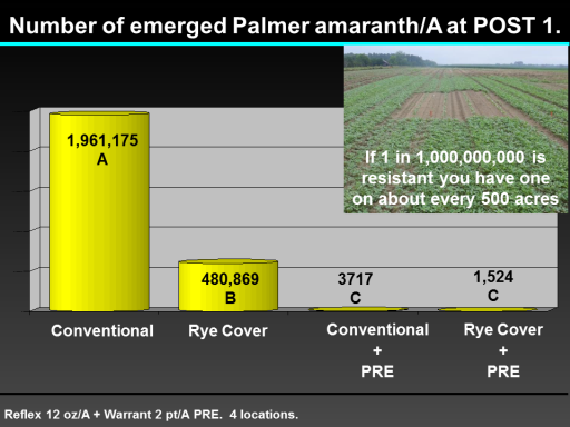 Conventional<BR>1,961,175 <BR>A<BR>480,869 <BR>B<BR>3717 <BR>C<BR>1,524 <BR>C<BR>Reflex 12 oz/A + Warrant 2 pt/A PRE.  4 locations.<BR>Number of emerged Palmer amaranth/A at POST 1.<BR>Rye Cover<BR>Conventional <BR>+ <BR>PRE<BR>Rye Cover <BR>+ <BR>PRE<BR>If 1 in 1,000,000,000 is resistant you have one on about every 500 acres<BR>