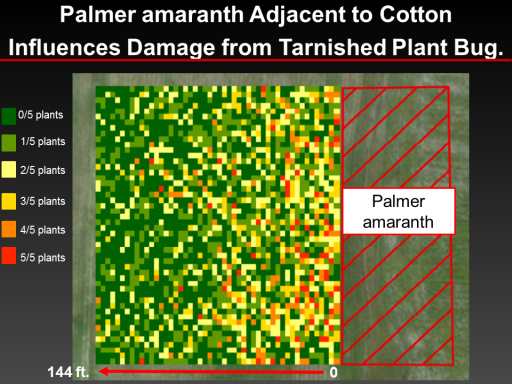 Palmer amaranth<BR>0<BR>144 ft.<BR>0/5 plants<BR>2/5 plants<BR>1/5 plants<BR>3/5 plants<BR>4/5 plants<BR>5/5 plants<BR>Palmer amaranth Adjacent to Cotton Influences Damage from Tarnished Plant Bug.<BR>