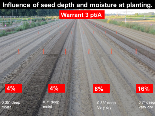 0.35” deep <BR>moist<BR>0.7” deep <BR>moist<BR>0.35” deep <BR>Very dry	<BR>0.7” deep <BR>Very dry<BR>Influence of seed depth and moisture at planting. <BR>Warrant 3 pt/A<BR>8%<BR>16%<BR>4%<BR>4%<BR>