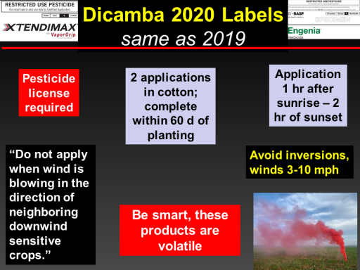 Dicamba 2020 Labels <BR>same as 2019<BR> <BR> <BR> <BR> <BR> <BR> <BR> <BR>Pesticide license required<BR>2 applications in cotton; complete within 60 d of planting<BR>Application 1 hr after sunrise – 2 hr of sunset<BR>“Do not apply when wind is blowing in the direction of neighboring downwind sensitive crops.”<BR>Be smart, these products are volatile<BR>Avoid inversions, winds 3-10 mph<BR>