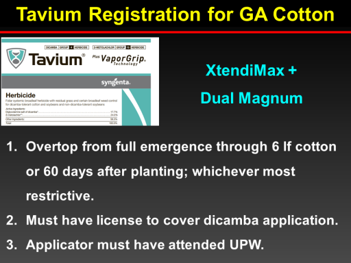 Tavium Registration for GA Cotton<BR>XtendiMax + Dual Magnum <BR>Overtop from full emergence through 6 lf cotton or 60 days after planting; whichever most restrictive.  <BR>Must have license to cover dicamba application. <BR>Applicator must have attended UPW.<BR>