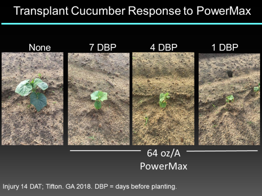 Transplant Cucumber Response to PowerMax<BR>None<BR>7 DBP <BR>4 DBP<BR>1 DBP<BR>Injury 14 DAT; Tifton. GA 2018. DBP = days before planting.<BR>64 oz/A <BR>PowerMax<BR>