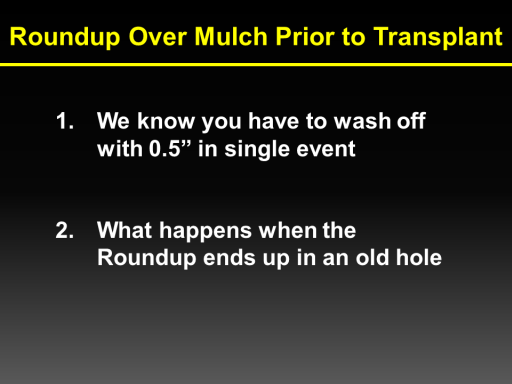 Roundup Over Mulch Prior to Transplant <BR>We know you have to wash off with 0.5” in single event <BR> <BR>What happens when the Roundup ends up in an old hole <BR>