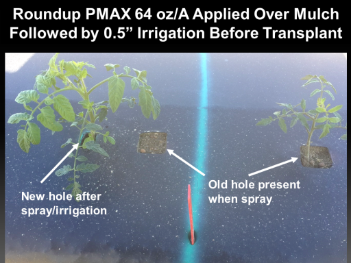 Roundup PMAX 64 oz/A Applied Over Mulch Followed by 0.5” Irrigation Before Transplant <BR>Old hole present when spray<BR>New hole after spray/irrigation<BR>