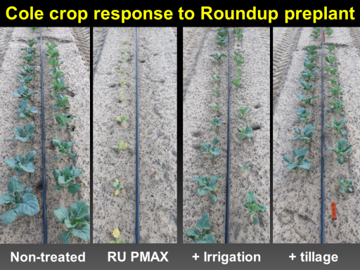 Non-treated<BR>RU PMAX<BR>+ Irrigation<BR>+ tillage<BR>Cole crop response to Roundup preplant<BR>