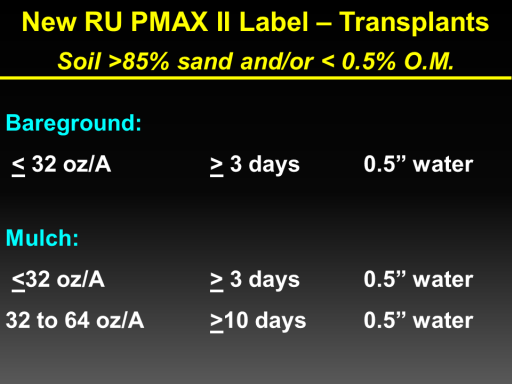 New RU PMAX II Label – Transplants <BR>Soil >85% sand and/or < 0.5% O.M.<BR>Bareground:  <BR> < 32 oz/A		> 3 days		0.5” water <BR>  <BR>Mulch: <BR> <32 oz/A 		> 3 days		0.5” water <BR>32 to 64 oz/A 		>10 days		0.5” water<BR>