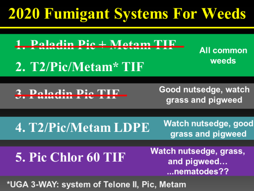 2020 Fumigant Systems For Weeds<BR>Paladin Pic + Metam TIF  <BR>T2/Pic/Metam* TIF<BR>4. T2/Pic/Metam LDPE<BR>5. Pic Chlor 60 TIF<BR>3. Paladin Pic TIF<BR>All common weeds<BR>Good nutsedge, watch grass and pigweed<BR>Watch nutsedge, good grass and pigweed<BR>Watch nutsedge, grass, and pigweed… ...nematodes??<BR>*UGA 3-WAY: system of Telone II, Pic, Metam<BR>