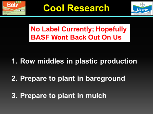 Cool Research<BR>No Label Currently; Hopefully BASF Wont Back Out On Us<BR>Row middles in plastic production <BR> <BR>Prepare to plant in bareground <BR> <BR>Prepare to plant in mulch<BR>