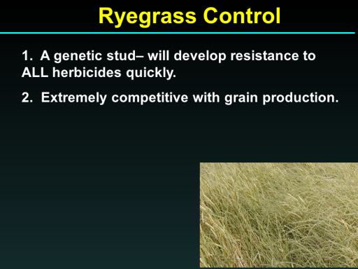 Ryegrass Control<BR>1.  A genetic stud– will develop resistance to ALL herbicides quickly. <BR>2.  Extremely competitive with grain production.<BR>