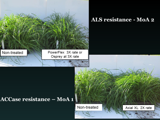 Non-treated<BR>PowerFlex  3X rate or Osprey at 3X rate<BR>Non-treated<BR>Axial XL  2X rate<BR> ALS resistance - MoA 2 <BR> ACCase resistance – MoA 1 <BR>