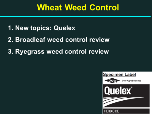 Wheat Weed Control <BR> <BR>1. New topics: Quelex <BR>2. Broadleaf weed control review <BR>3. Ryegrass weed control review<BR>