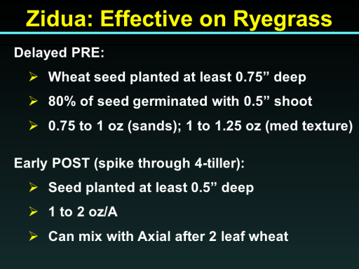 Delayed PRE: <BR>Wheat seed planted at least 0.75” deep <BR>80% of seed germinated with 0.5” shoot <BR>0.75 to 1 oz (sands); 1 to 1.25 oz (med texture)<BR>Zidua: Effective on Ryegrass<BR> Early POST (spike through 4-tiller): <BR>Seed planted at least 0.5” deep <BR>1 to 2 oz/A <BR>Can mix with Axial after 2 leaf wheat<BR>