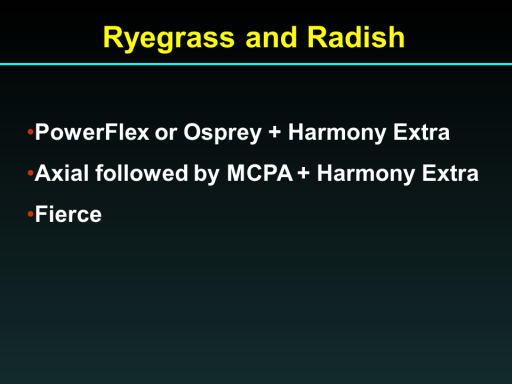 Ryegrass and Radish<BR>PowerFlex or Osprey + Harmony Extra <BR>Axial followed by MCPA + Harmony Extra <BR>Fierce<BR>