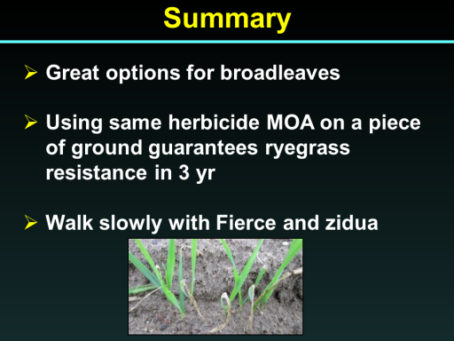 Summary<BR>Great options for broadleaves <BR> <BR>Using same herbicide MOA on a piece of ground guarantees ryegrass resistance in 3 yr <BR> <BR>Walk slowly with Fierce and zidua <BR>