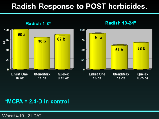 Radish Response to POST herbicides. <BR>Wheat 4-19.  21 DAT. <BR>80 b<BR>90 a<BR>XtendiMax <BR>11 oz<BR>Quelex <BR>0.75 oz<BR>87 b<BR>61 b<BR>68 b<BR>91 a<BR>XtendiMax <BR>11 oz<BR>Quelex <BR>0.75 oz<BR>Enlist One <BR>16 oz<BR>*MCPA = 2,4-D in control<BR>Radish 4-8”<BR>Radish 18-24”<BR>
