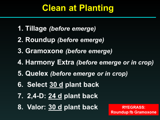Clean at Planting <BR>  <BR>		1. Tillage (before emerge) <BR>		2. Roundup (before emerge) <BR>		3. Gramoxone (before emerge) <BR>		4. Harmony Extra (before emerge or in crop) <BR>		5. Quelex (before emerge or in crop)  <BR>  		6.  Select 30 d plant back  <BR>		7.  2,4-D: 24 d plant back  <BR>		8.  Valor: 30 d plant back<BR>RYEGRASS:  <BR>Roundup fb Gramoxone<BR>