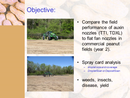 Objective:<BR>Compare the field performance of auxin nozzles (TTI, TDXL)  to flat fan nozzles in commercial peanut fields (year 2).  <BR> <BR>Spray card analysis <BR>droplet size and coverage <BR>DropletScan or DepositScan <BR> <BR>weeds, insects, disease, yield<BR>