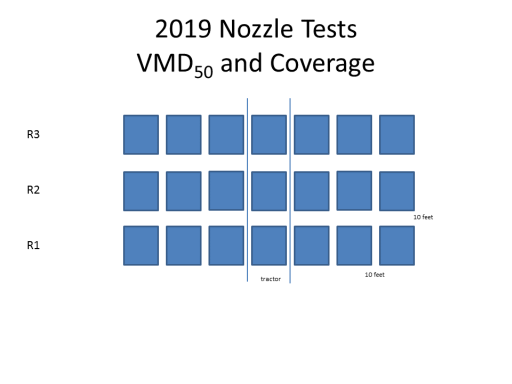 2019 Nozzle Tests VMD50 and Coverage<BR>R1<BR>R2<BR>R3<BR>10 feet<BR>10 feet<BR>tractor<BR>