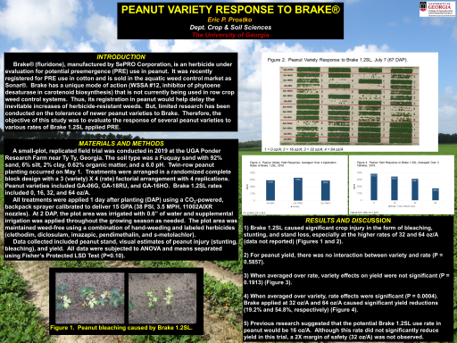 PEANUT VARIETY RESPONSE TO BRAKE® <BR>Eric P. Prostko  <BR>Dept. Crop & Soil Sciences <BR>The University of Georgia<BR>INTRODUCTION <BR>     Brake® (fluridone), manufactured by SePRO Corporation, is an herbicide under evaluation for potential preemergence (PRE) use in peanut.  It was recently registered for PRE use in cotton and is sold in the aquatic weed control market as Sonar®.  Brake has a unique mode of action (WSSA #12, inhibitor of phytoene desaturase in carotenoid biosynthesis) that is not currently being used in row crop weed control systems.  Thus, its registration in peanut would help delay the inevitable increases of herbicide-resistant weeds.  But, limited research has been conducted on the tolerance of newer peanut varieties to Brake.  Therefore, the objective of this study was to evaluate the response of several peanut varieties to various rates of Brake 1.2SL applied PRE.   <BR>MATERIALS AND METHODS <BR>     A small-plot, replicated field trial was conducted in 2019 at the UGA Ponder Research Farm near Ty Ty, Georgia. The soil type was a Fuquay sand with 92% sand, 6% silt, 2% clay, 0.62% organic matter, and a 6.0 pH.  Twin-row peanut planting occurred on May 1.  Treatments were arranged in a randomized complete block design with a 3 (variety) X 4 (rate) factorial arrangement with 4 replications.  Peanut varieties included GA-06G, GA-18RU, and GA-16HO.  Brake 1.2SL rates included 0, 16, 32, and 64 oz/A.  <BR>     All treatments were applied 1 day after planting (DAP) using a CO2-powered, backpack sprayer calibrated to deliver 15 GPA (38 PSI, 3.5 MPH, 11002AIXR nozzles).  At 2 DAP, the plot area was irrigated with 0.6” of water and supplemental irrigation was applied throughout the growing season as needed.  The plot area was maintained weed-free using a combination of hand-weeding and labeled herbicides (clethodim, diclosulam, imazapic, pendimethalin, and s-metolachlor).   <BR>     Data collected included peanut stand, visual estimates of peanut injury (stunting, bleaching), and yield.  All data were subjected to ANOVA and means separated using Fisher’s Protected LSD Test (P=0.10).  <BR>RESULTS AND DISCUSSION <BR>1) Brake 1.2SL caused significant crop injury in the form of bleaching, stunting, and stand loss, especially at the higher rates of 32 and 64 oz/A (data not reported) (Figures 1 and 2). <BR>  <BR>2) For peanut yield, there was no interaction between variety and rate (P = 0.5857). <BR> <BR>3) When averaged over rate, variety effects on yield were not significant (P = 0.1913) (Figure 3). <BR> <BR>4) When averaged over variety, rate effects were significant (P = 0.0004).  Brake applied at 32 oz/A and 64 oz/A caused significant yield reductions (19.2% and 54.8%, respectively) (Figure 4). <BR> <BR>5) Previous research suggested that the potential Brake 1.2SL use rate in peanut would be 16 oz/A.  Although this rate did not significantly reduce yield in this trial, a 2X margin of safety (32 oz/A) was not observed.  <BR>