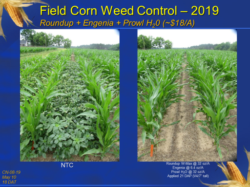 Field Corn Weed Control – 2019 Roundup + Engenia + Prowl H20 (~$18/A)<BR>CN-08-19 <BR>May 10 <BR>18 DAT<BR>NTC<BR>Roundup W-Max @ 32 oz/A <BR>Engenia @ 6.4 oz/A <BR>Prowl H2O @ 32 oz/A <BR>Applied 21 DAP (V4/7” tall)<BR>