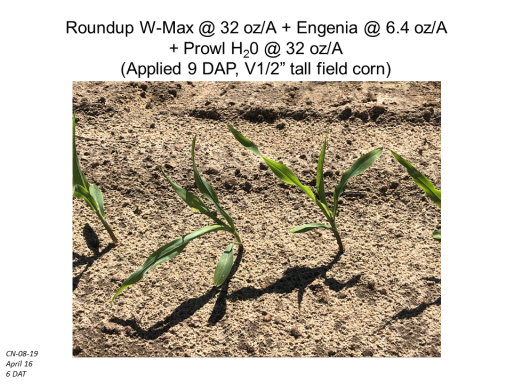 Roundup W-Max @ 32 oz/A + Engenia @ 6.4 oz/A  + Prowl H20 @ 32 oz/A (Applied 9 DAP, V1/2” tall field corn)<BR>CN-08-19 <BR>April 16 <BR>6 DAT<BR>