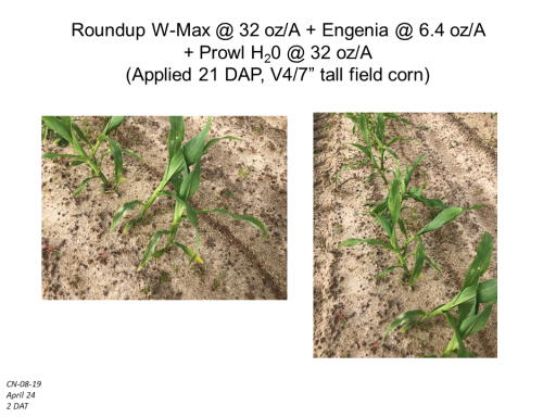 Roundup W-Max @ 32 oz/A + Engenia @ 6.4 oz/A  + Prowl H20 @ 32 oz/A (Applied 21 DAP, V4/7” tall field corn)<BR>CN-08-19 <BR>April 24 <BR>2 DAT<BR>