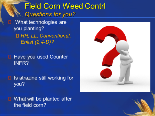 Field Corn Weed Contrl Questions for you?<BR> What technologies are  you planting? <BR>RR, LL, Conventional, Enlist (2,4-D)? <BR> <BR>Have you used Counter INFR? <BR> <BR>Is atrazine still working for you? <BR> <BR>What will be planted after the field corn?<BR>
