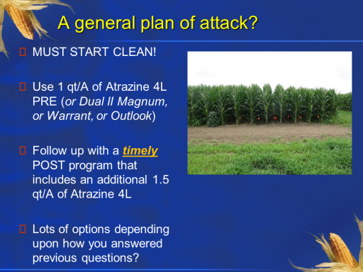 A general plan of attack?<BR>MUST START CLEAN! <BR> <BR>Use 1 qt/A of Atrazine 4L PRE (or Dual II Magnum, or Warrant, or Outlook) <BR> <BR>Follow up with a timely POST program that includes an additional 1.5 qt/A of Atrazine 4L <BR> <BR>Lots of options depending upon how you answered previous questions?<BR>